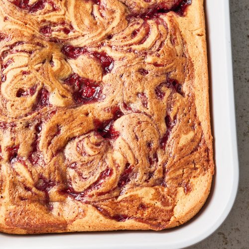 But, after a few variations, this cake turned out even better than I imagined. I’ve taken a super basic, peanut packed cake and swirled it with dollops of bright, tangy raspberry jam and actual raspberries for even more flavor.